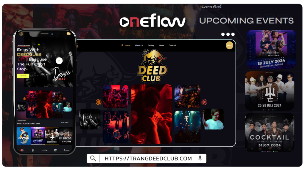 Trang Deed Club ถูกออกแบบให้สะท้อนบรรยากาศความสนุกและความมีระดับของไนท์คลับ ด้วยโทนสีที่ทันสมัย กราฟิกที่โดดเด่น และการจัดวางเนื้อหาที่ช่วยดึงดูดสายตา ฟังก์ชันบนเว็บไซต์ถูกออกแบบมาเพื่อรองรับการใช้งานที่ง่าย ทั้งข้อมูลเกี่ยวกับบริการ กิจกรรมพิเศษ และการจองโต๊ะออนไลน์